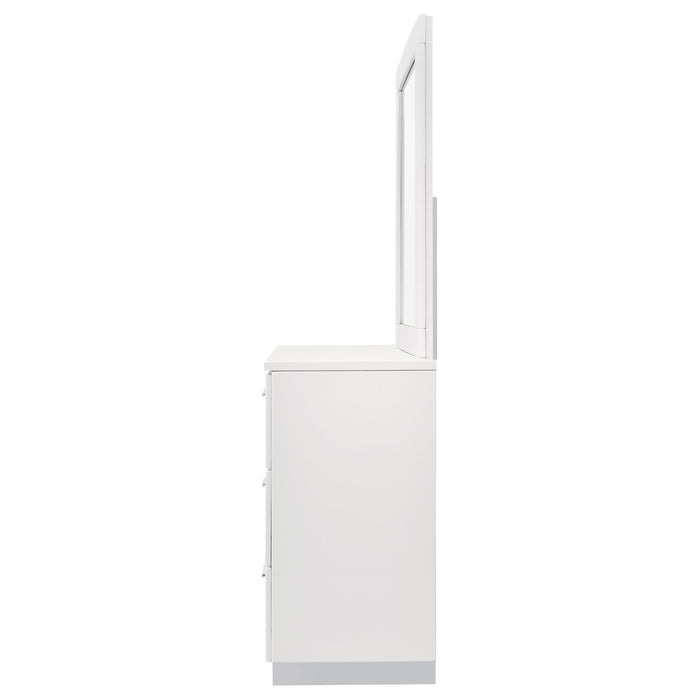 This dresser and mirror set brings streamlined function to contemporary bedrooms. The six-drawer dresser offers ample storage with smooth metal extension glides, while the mirror features a white high gloss frame that reflects light and complements the dresser’s modern silhouette. Chrome-finished handles and feet enhance the look with refined detail, making this set a practical yet stylish addition to your space. Key Features: • Modern dresser and mirror set featuring sleek, clean-lined contemporary design • Dresser finished in white high gloss for a crisp, bright, and polished appearance • Six spacious drawers offer ample room with smooth metal extension glides • Mirror includes a rectangular frame finished in matching high gloss white • Chrome-finished metal handles and feet provide refined, modern contrast • Built for durability and functionality in today’s stylish bedroom interiors