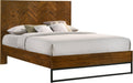 Create a distinctly contemporary vibe in your bedroom sanctuary with this Reed queen-sized bed from the Reed Wood collection. This handsome bed offers a touch of traditional flair with its antique coffee finish and chevron inlaid wood design. It rests on a metal base in sleek black matte for a modern touch. The hardware-free design lends authenticity to the chic, sophisticated and minimalist design of this bed, which features an extra-tall headboard for a dramatic finish.
